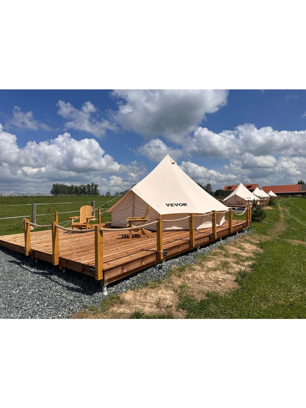 Glampingový stan, to je luxusní příbytek s matracemi a peřinami, s elektrickými zásuvkami uvnitř a s dřevěnou terasou s posezením a ohništěm venku. Spát se vám tu bude náramně.